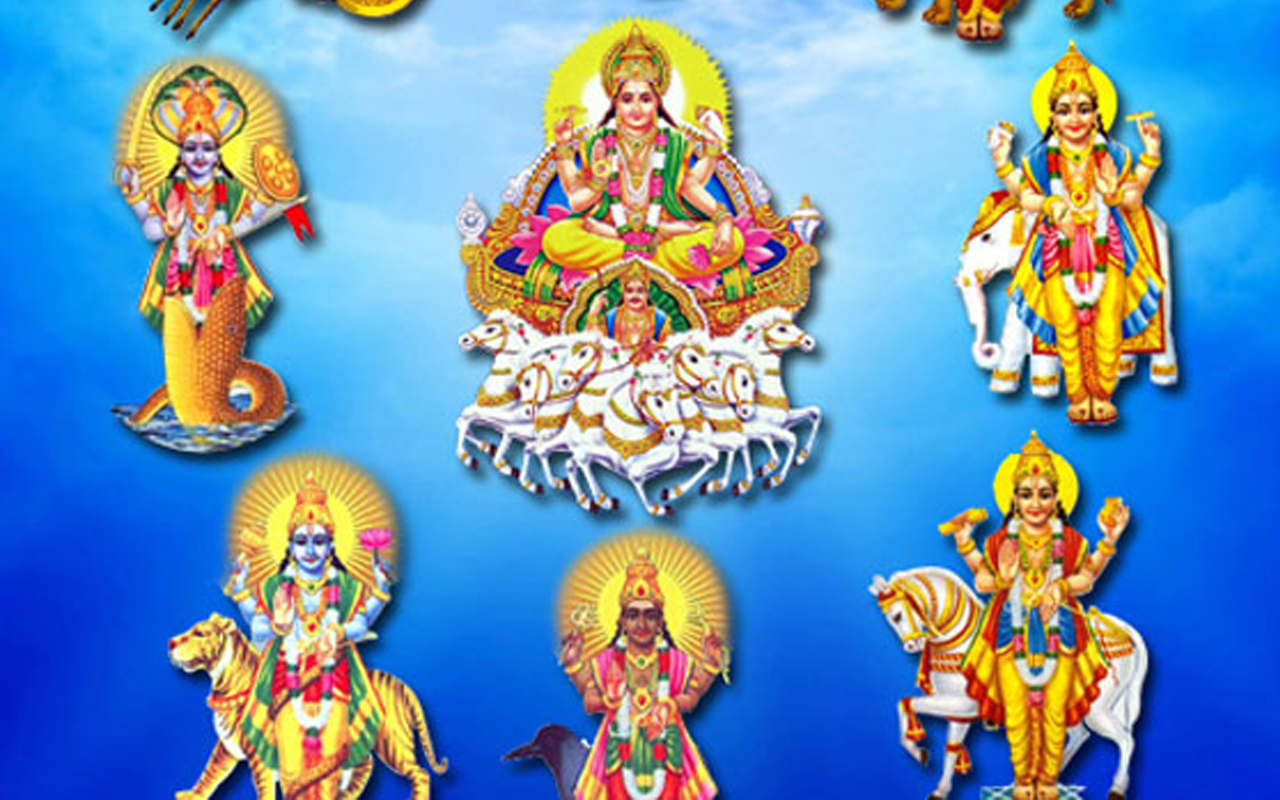 According to Vedas and Shastras there are many planets & stars but only Nine (Nav=9) Planets (Grah) and 27stars that fell into immediate circumference of the solar system and are likely to affect our lives depending upon their position in our natal chart are considered. These nine planets form an orbit called as Navagraha Mandal. The nine "grahas" or planets in our horoscope control our karma, our desires and their outcomes. Each of these nine planets exerts an influence in our lives, which is called "dasa" and it can be known from one's horoscope. Navagraha Shanti pooja is undertaken to reduce the pessimistic effects and improve the optimistic energies related to a person. The nine planets have special kshetras ( place of worship ) in South India. Most of them are concentrated near the Thanjavur district. Navagraha pooja will be helpful, when the concerned planet dasa or sub-dasa is in operation or if the planet is associated with malefics or is in the 3rd, 6th, 8th, or 12th house. Also as said earlier only 9 planets and 27 stars are considered. Within this Navagraha Mandal (the orbit formed by 9 planets) exist seven gods viz: Ganesha, Durga, Vaayu, Aakash, Ashwini, Kshetrapaal and Vaastoshpati. Enclosing this Navagraha Mandal there are another ten gods called Dashadik-Paalak. Enclosing Dashadik-Paalak is the set of lord that signifies our nature, which are classified as Satva Guna , (Kindheartedness) Rajoguna (Obsessive ness)andTamoguna (Rowdiness, Ruthless, Wickedness).